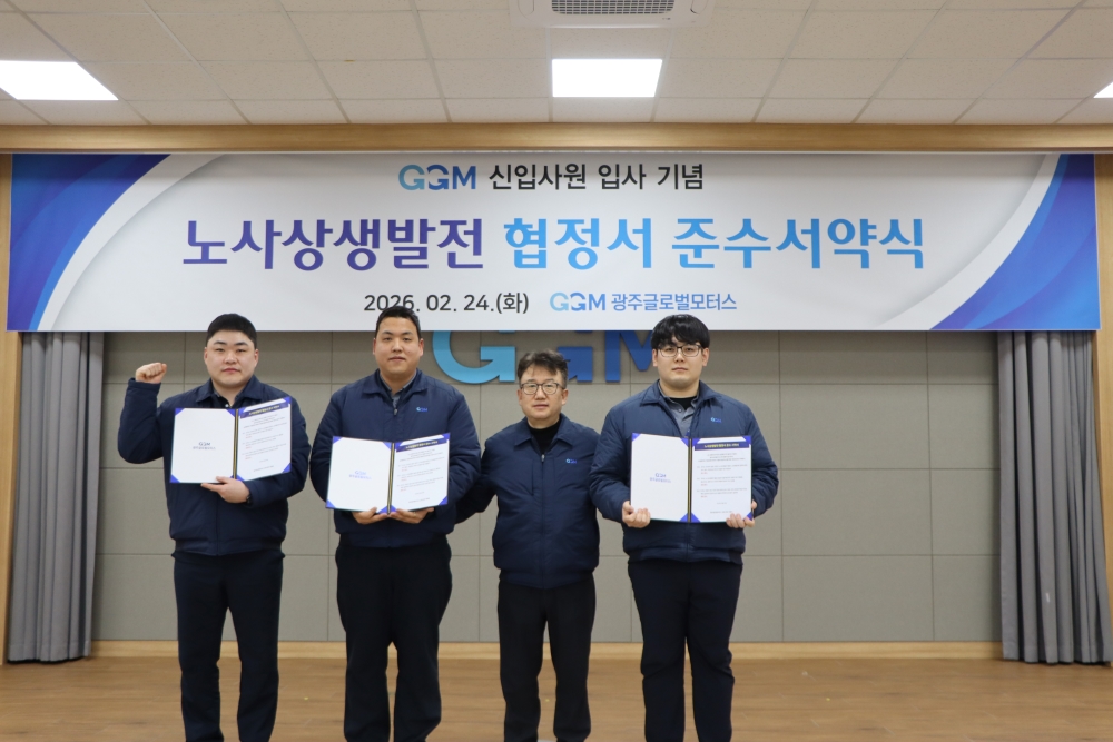 신입사원들은 “GGM의 설립 기반인 노사상생발전협정서와 상생협의회 운영에 관한 부속 결의, 적정 임금 관련 부속 협정서를 차질 없이 준수하겠다”고 다짐하며, 광주글로벌모터스의 구성원으로서 책임과 역할을 성실히 수행할 것을 약속했습니다.